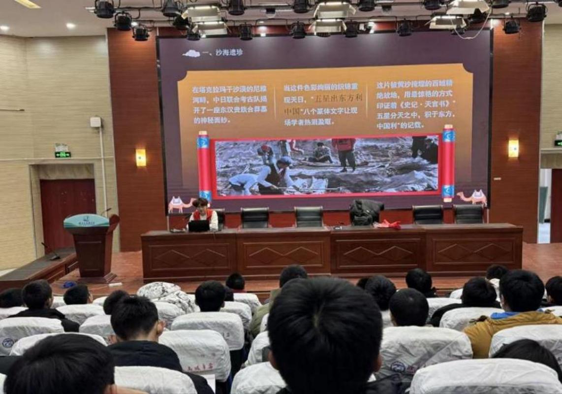 青少年历史文化研学团队走进塔里木高级中学,结合目前正在开展的青少年历史文化巡回宣讲项目,通过沉浸式宣讲、情景互动等多元形式,将克孜尔石窟艺术、汉代织锦与管道安全知识深度结合,为青少年呈现一场兼具历史厚度、趣味体验与责任教育的研学盛宴。